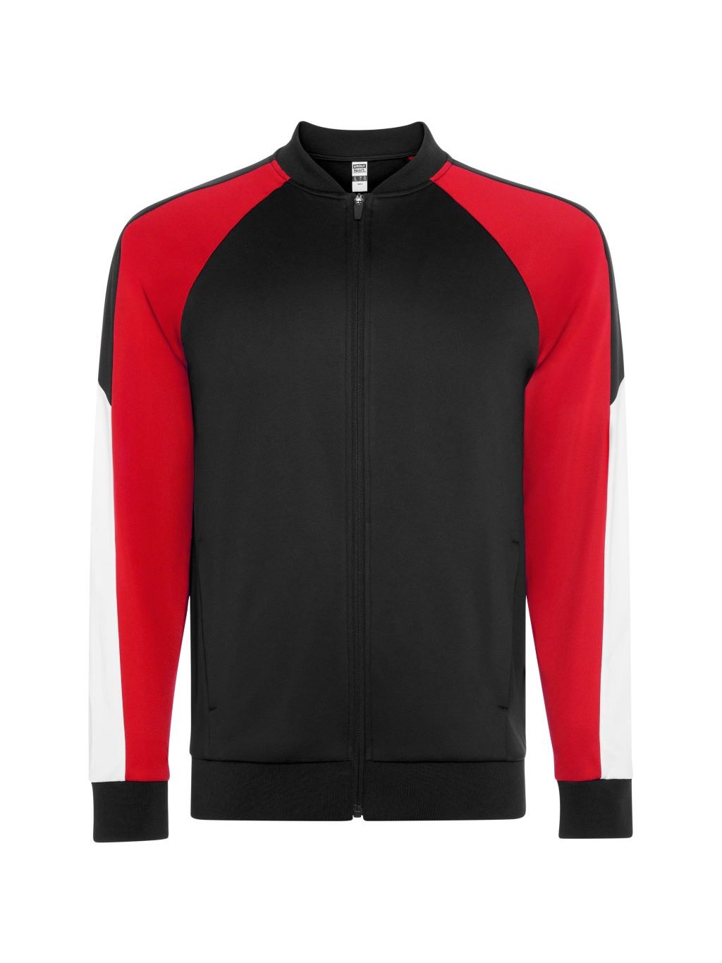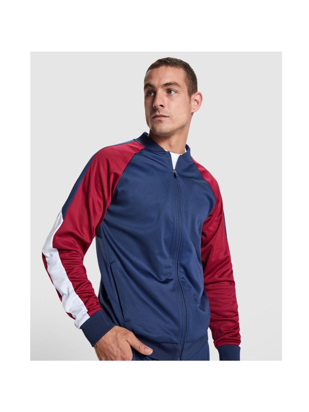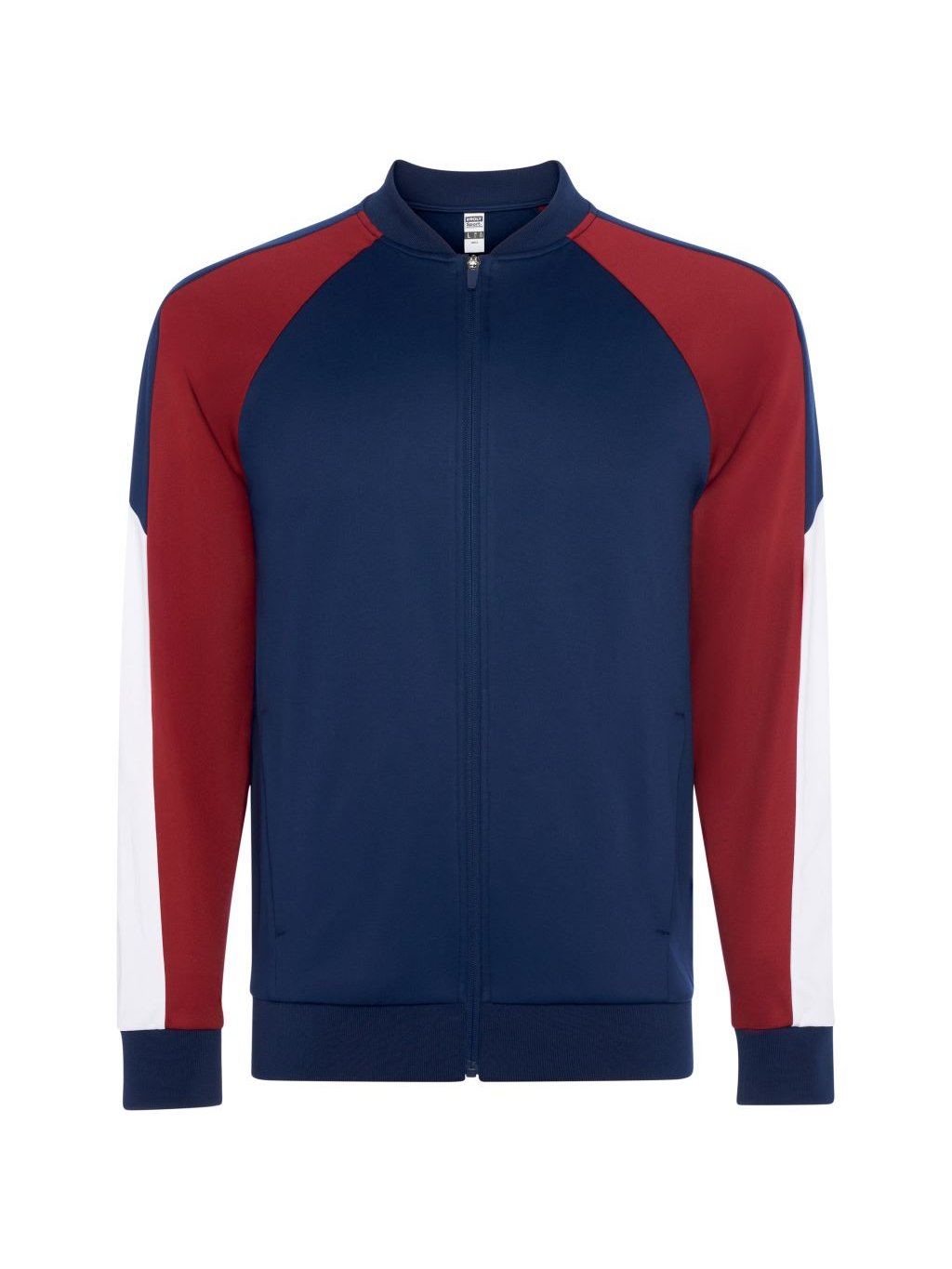 Sportovní bunda s raglánovými rukávy. Zapínání na zip na přední straně. Dvě boční kapsy se zapínáním na zip. Límec, manžety a lem s žebrováním 1x1. Kontrastní podlepený výstřih. Kontrastní rukávy s pruhy podél rukávu. Barevné varianty ladící s kalhotami URUS.