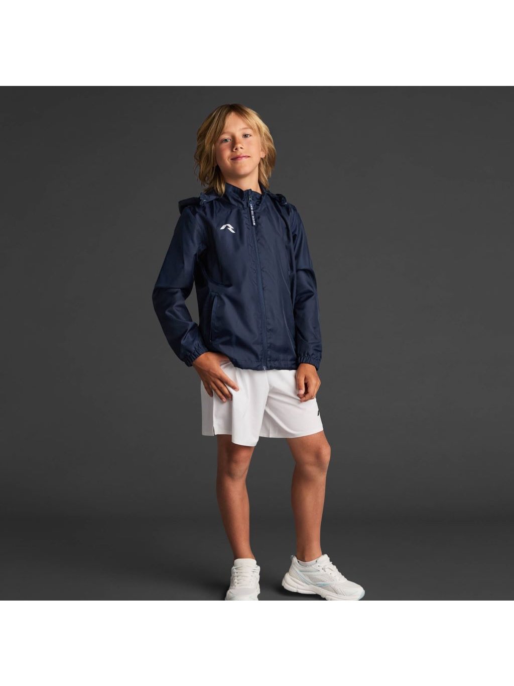 Dětská lehká funkční bunda z nepromokavého materiálu s volitelně dodávanou kapucí schovanou za krkem. Podšívka na těle ze síťoviny a na rukávech z polyesteru. Vodě a větru odolná.