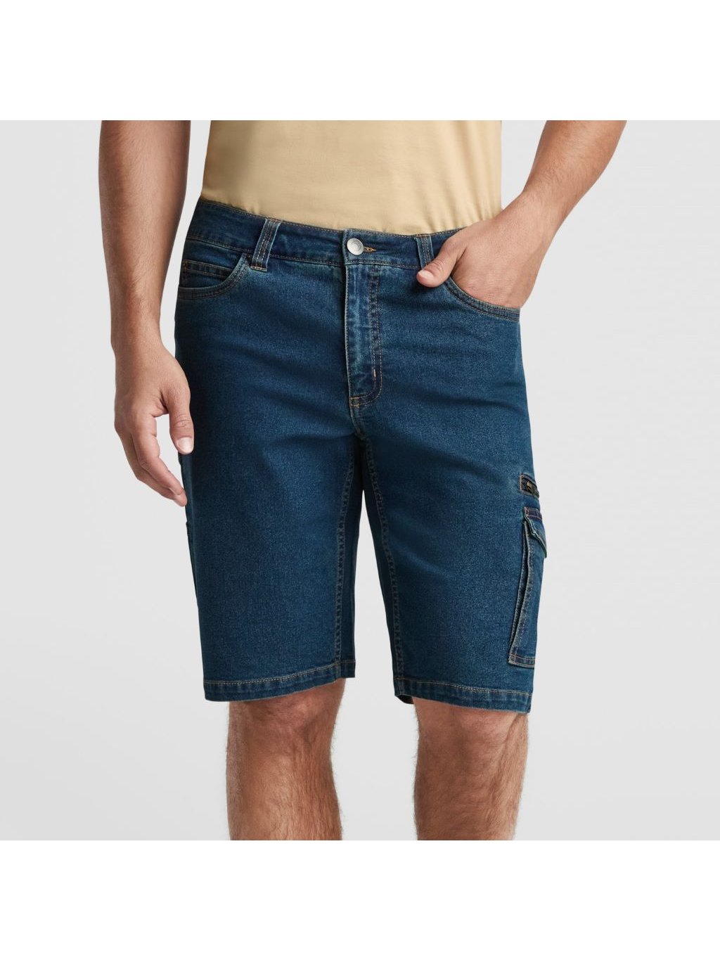 Džínové šortky s více kapsami. Odolná elastická tkanina. Pas s poutky na opasek. Dvě přední bederní kapsy s kapsou na mince na pravé straně. Dvě zadní kapsy. Pravá zadní kapsa s klopou a zapínáním na suchý zip. Integrovaná cargo kapsa se zapínáním na zip. Prodloužená víceúčelová kapsa na levé noze. Vnější štítek Roly WRK.