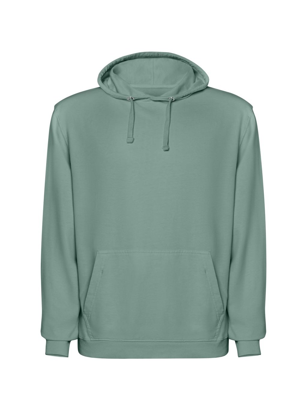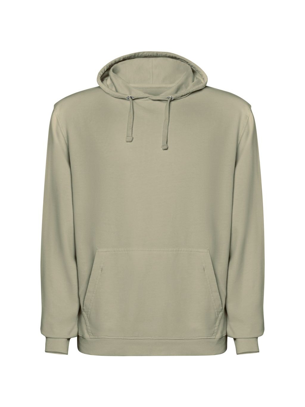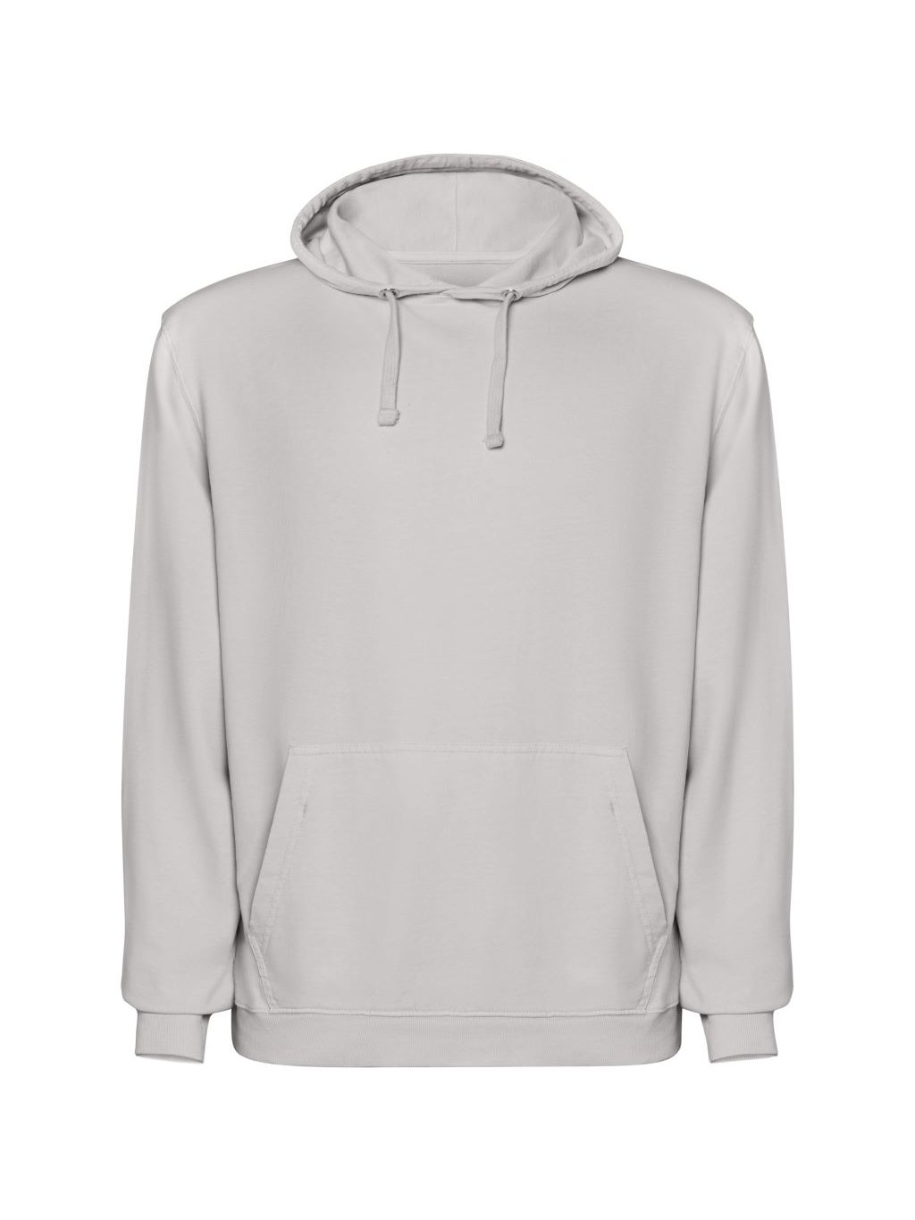 Unisex mikina s kapucí z nečesané bavlny s vypraným efektem. Klokaní kapsa. Manžety a pas s žebrováním 2x1 a s elastanem. Plochá stahovací šňůrka v barvě mikiny s kovovými očky. Podlepené švy ze stejného materiálu.