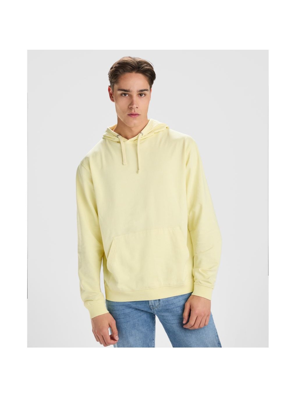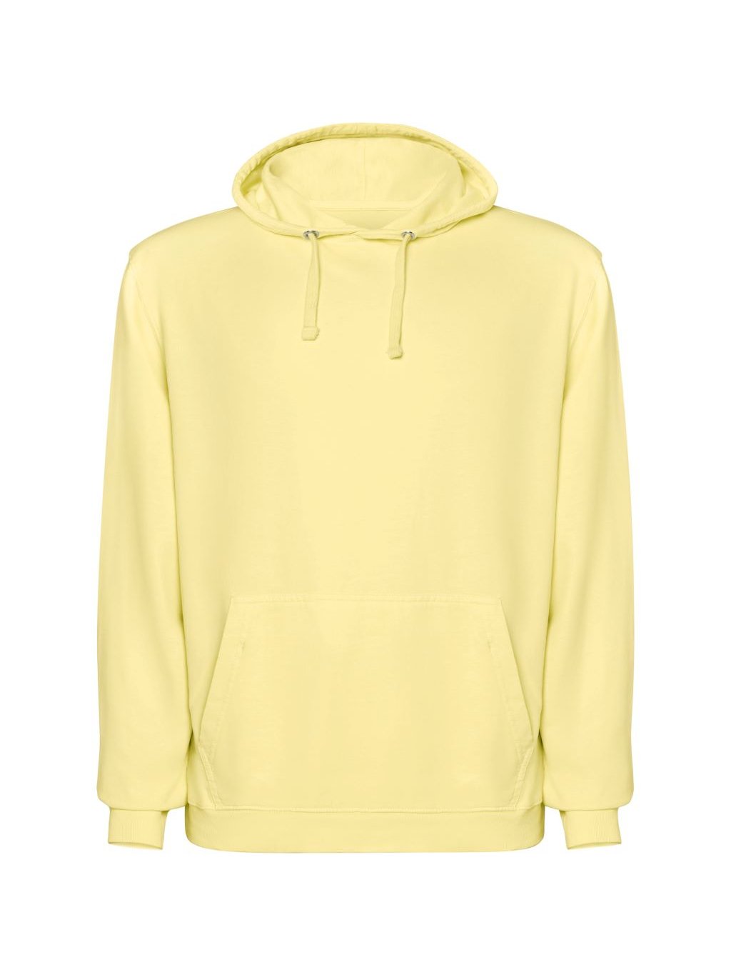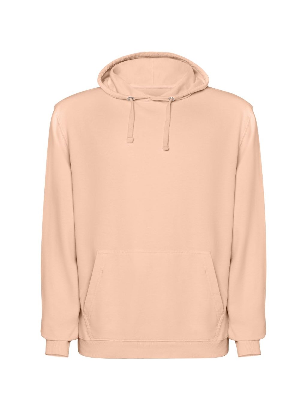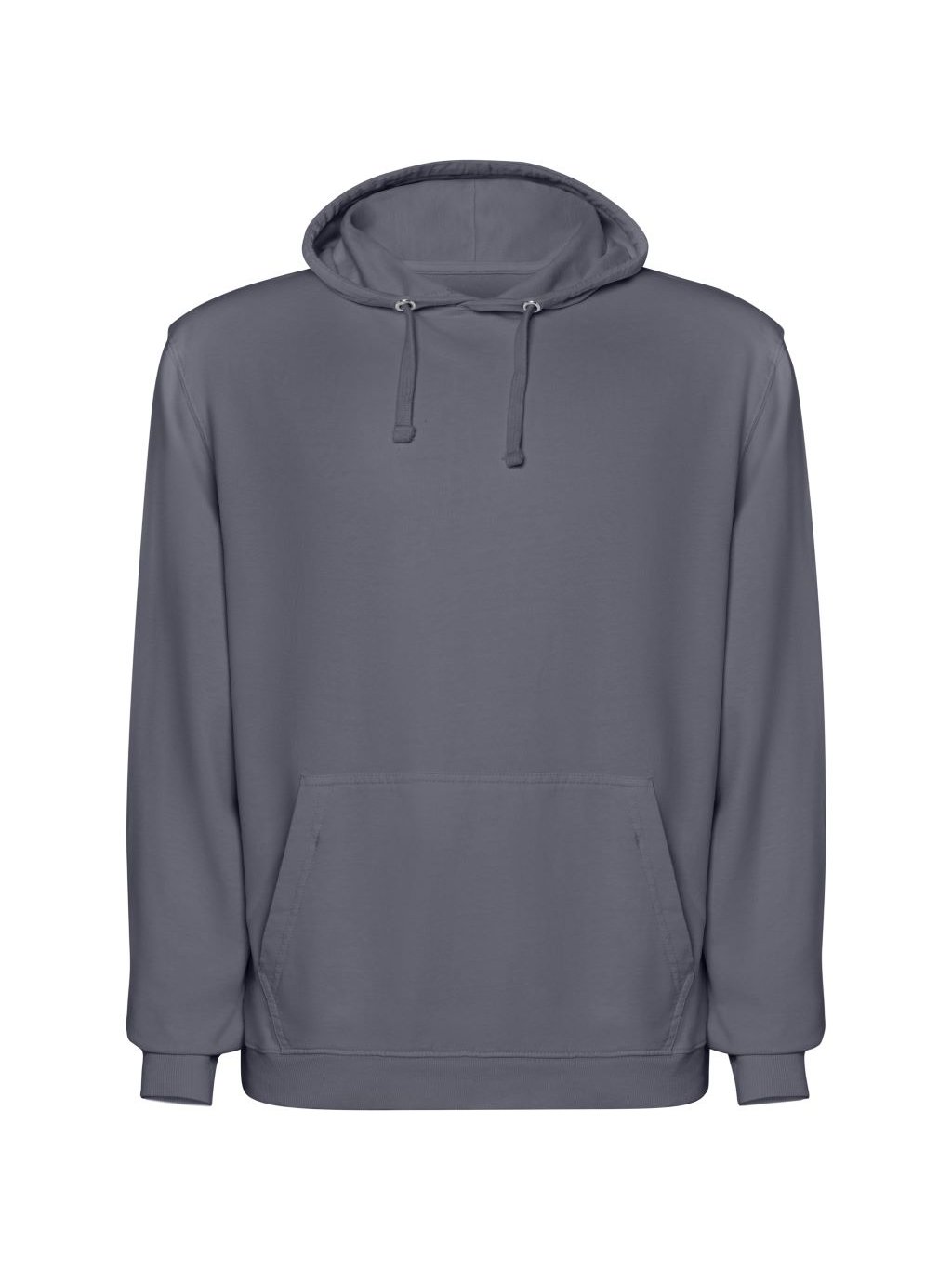 Unisex mikina s kapucí z nečesané bavlny s vypraným efektem. Klokaní kapsa. Manžety a pas s žebrováním 2x1 a s elastanem. Plochá stahovací šňůrka v barvě mikiny s kovovými očky. Podlepené švy ze stejného materiálu.