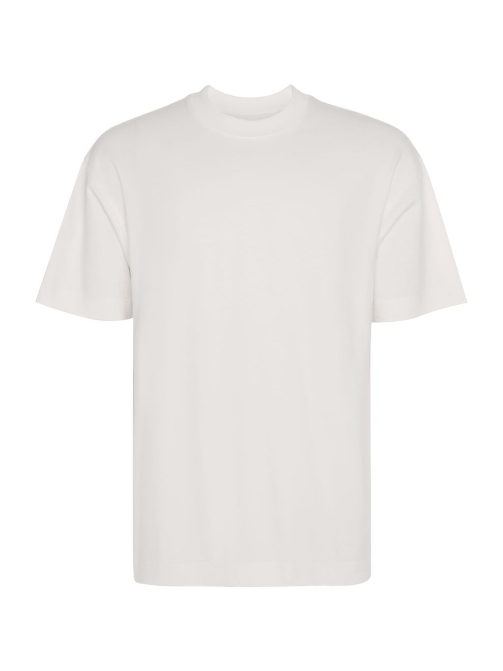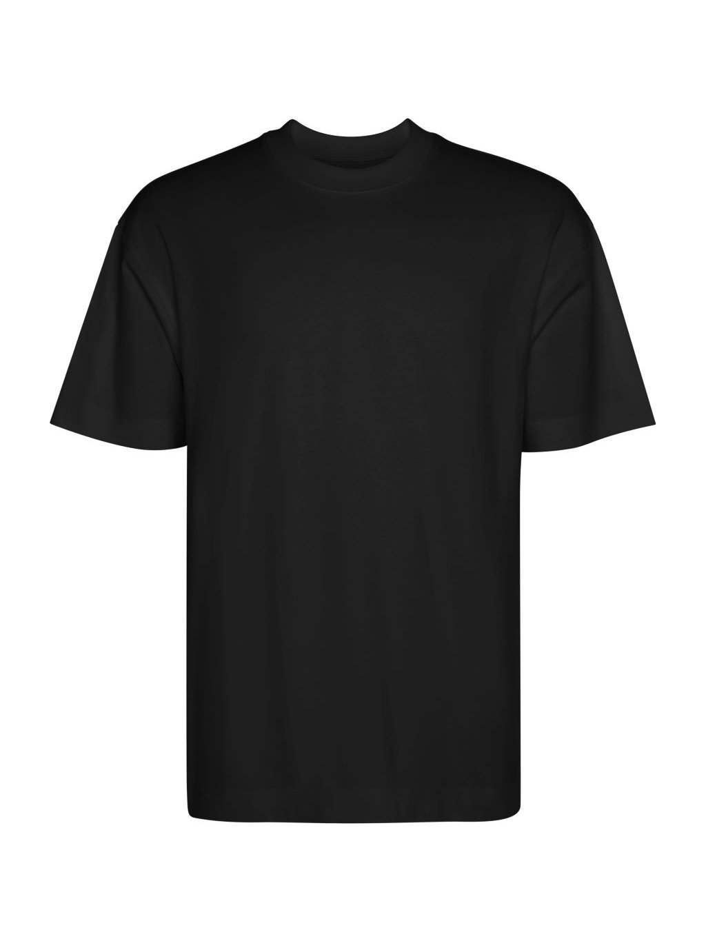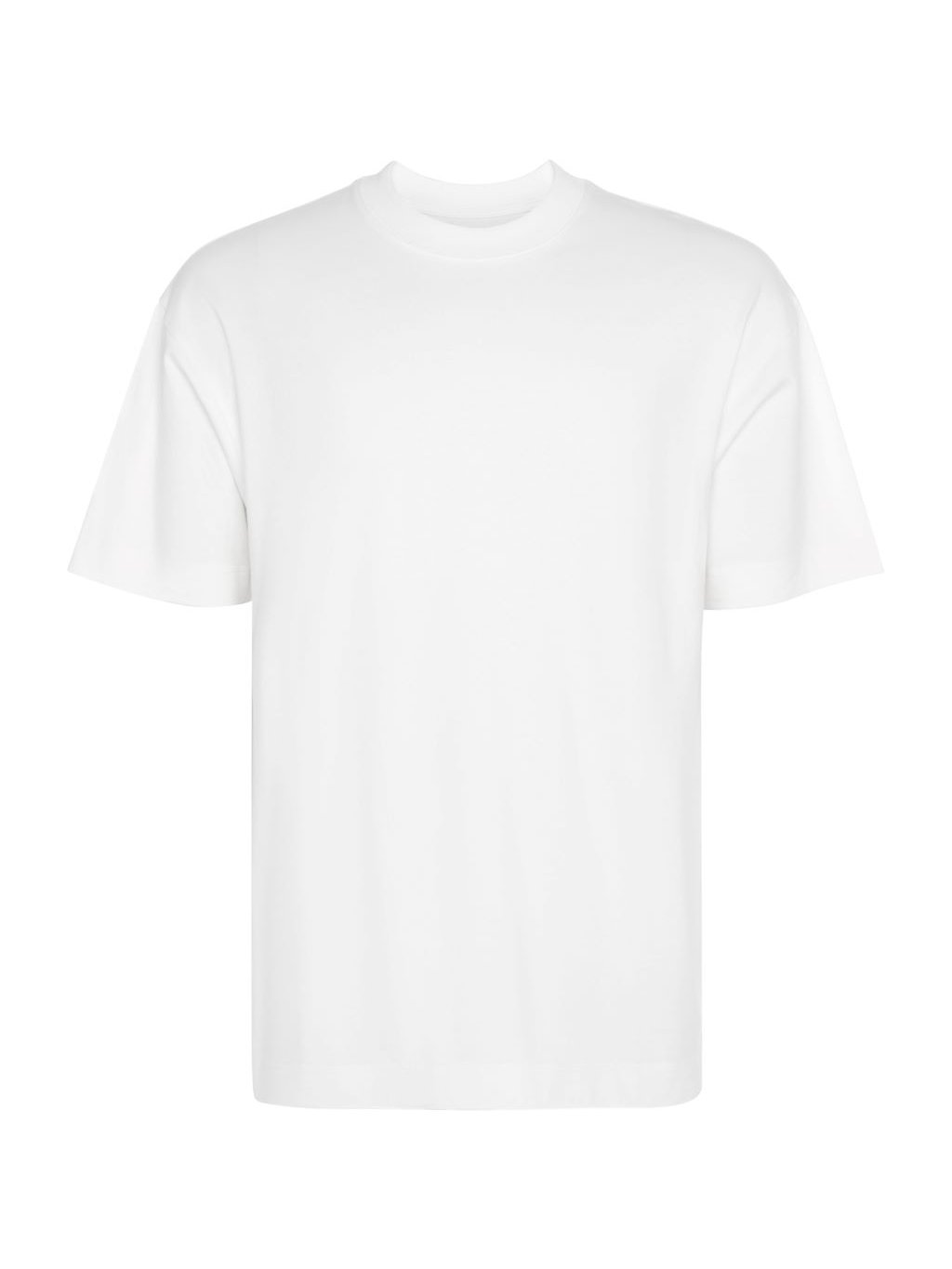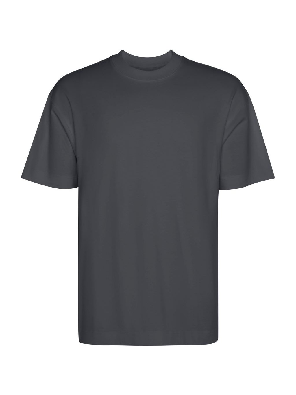 Tričko s krátkým rukávem v nadměrné velikosti. Široký kulatý výstřih s žebrováním 2x1. Podlepený výstřih ze stejného materiálu. Široké dvojité prošití na lemu a rukávech.