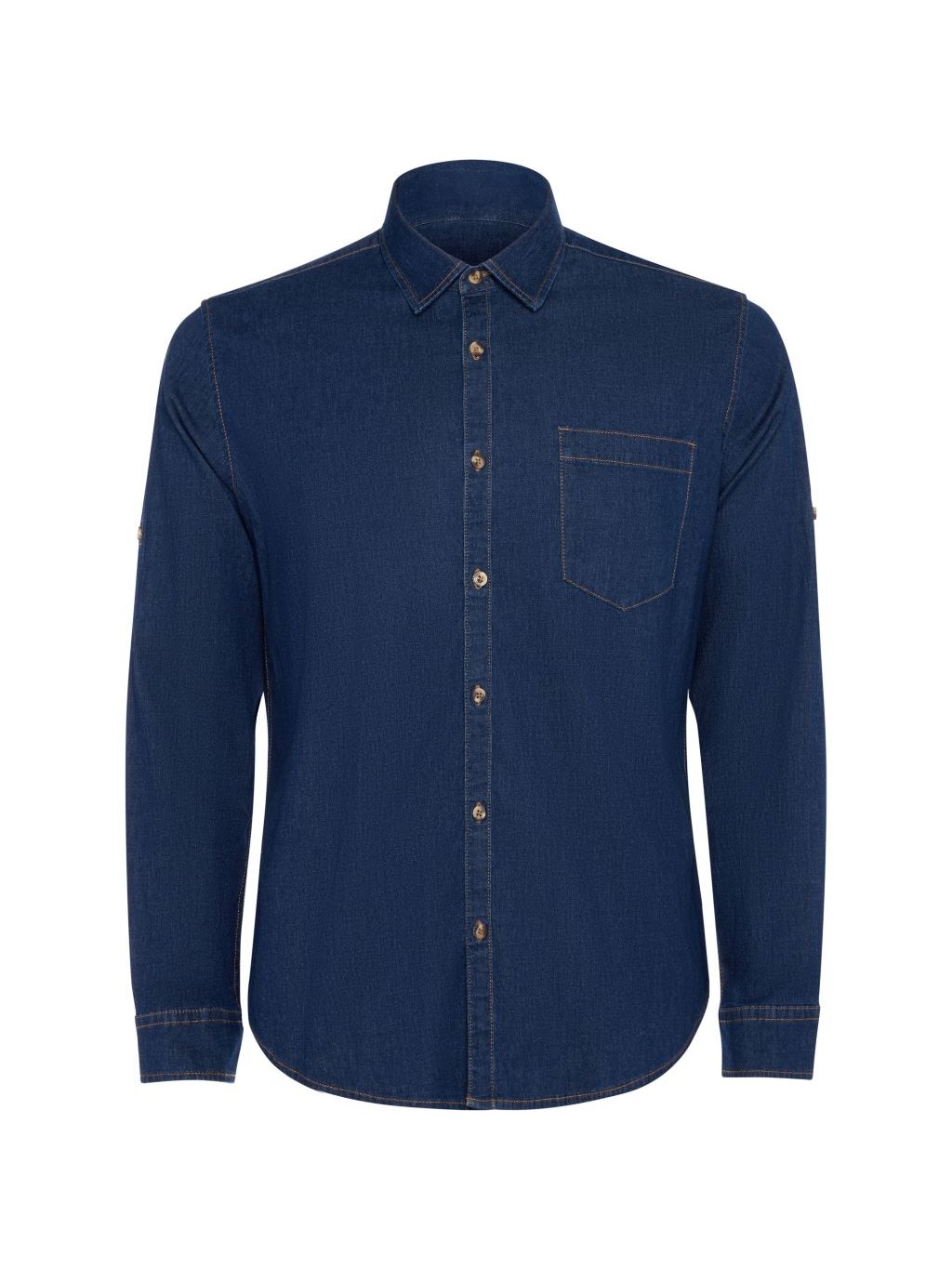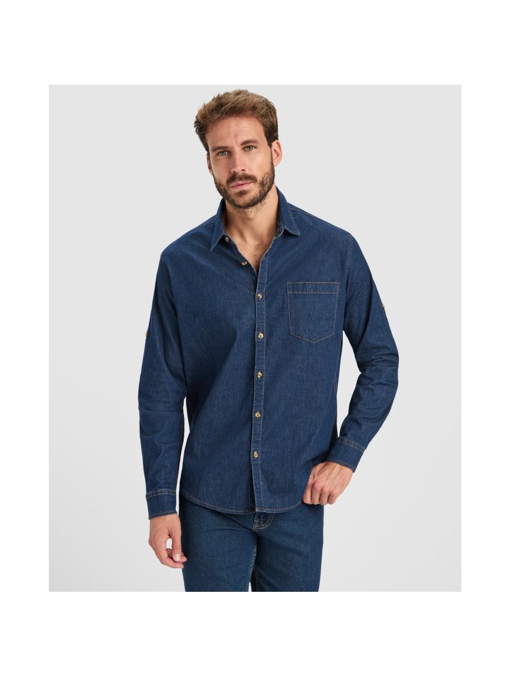 Džínová košile s dlouhým rukávem a nastavitelným poutkem na opasek. Strečová tkanina. Košilový límec. Přední ramenní švy a zadní sedlo. Kapsa ve tvaru V na levé straně hrudníku. Manžety s dvojitým knoflíkem a záhyby a další malý knoflík na manžetové léze. Zaoblené lemy.