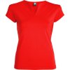 Vypasované dámské tričko s kulatým výstřihem prostřiženým do V. Krátké rukávky, boční švy.