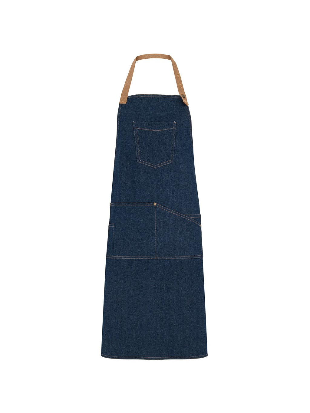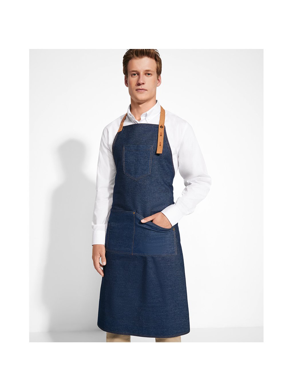 Dlouhá zástěra z džínoviny, která má kontrastní pásek za krk se třemi možnostmi nastavení kovovým knoflíkem, náprsní kapsu, čtyři přední kapsy s cvočky - jedna je určena speciálně pro propisovací tužku a postranní pásky na uvázání. Model je vhodný pro přípravu potravin.